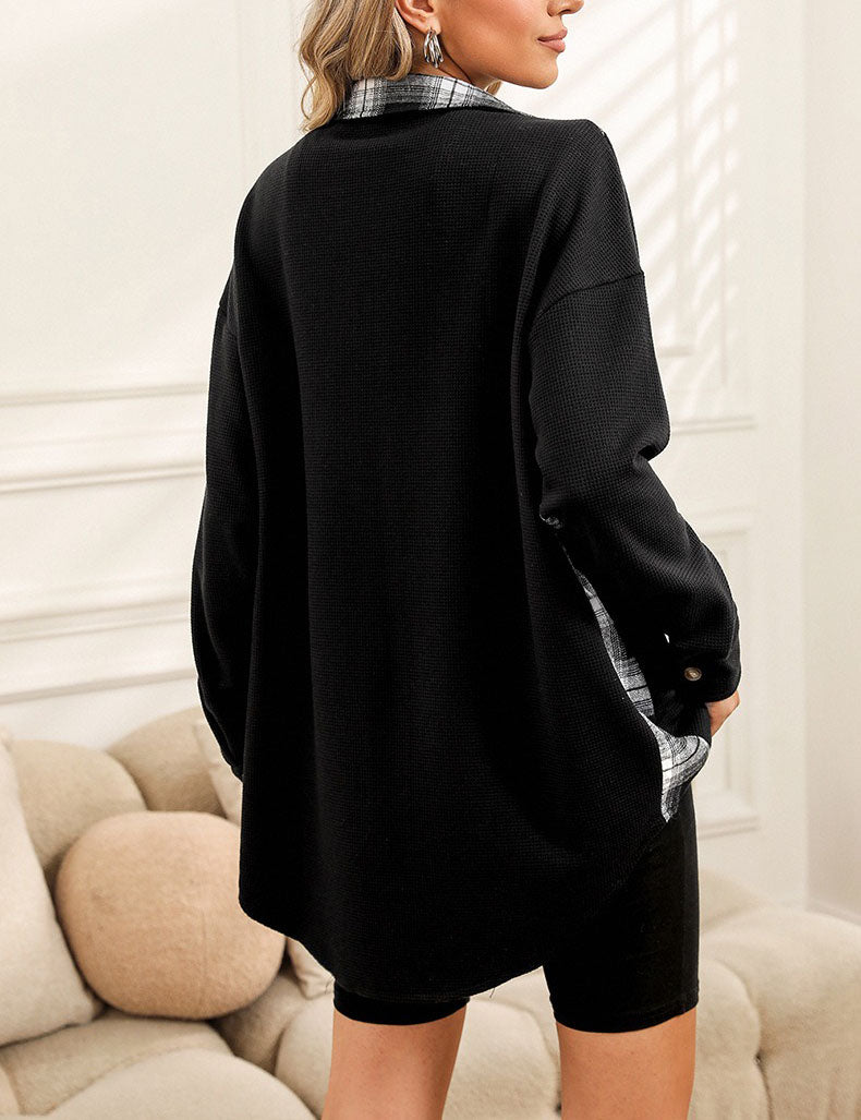Waffle Plaid Splicing Lapel Button Down Shirts