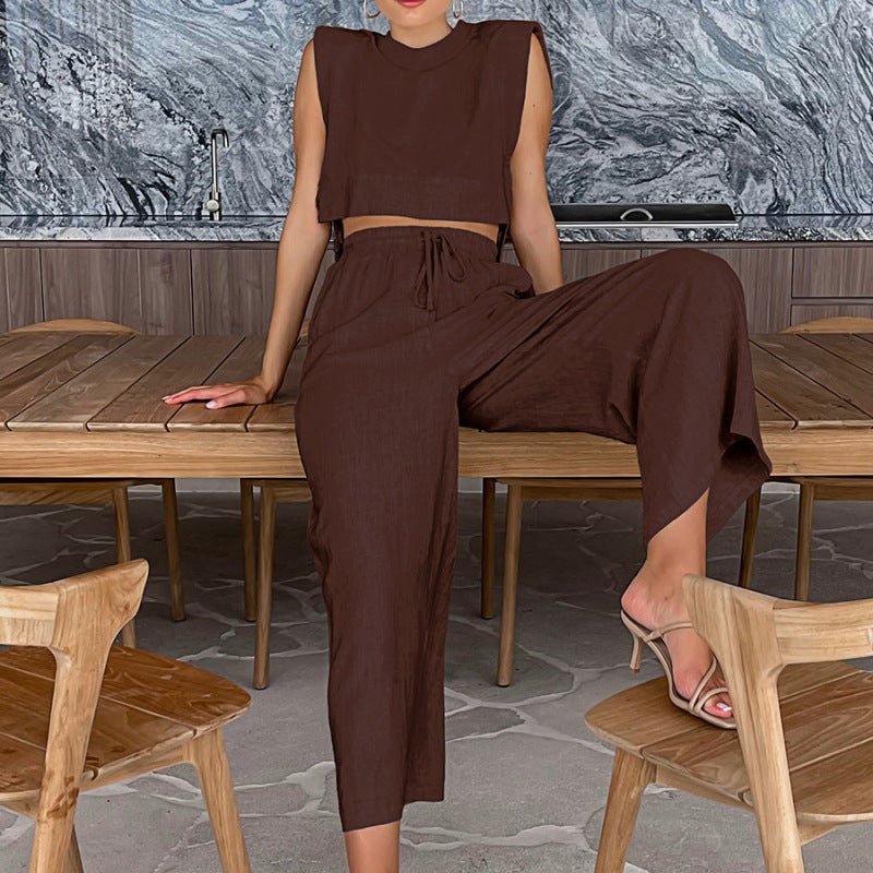 Rehaussez votre garde-robe avec notre ensemble décontracté pour femme, composé d'un chemisier sans manches et d'un pantalon en coton et lin de couleur unie. Cet ensemble élégant est parfait pour les aventures urbaines ou les escapades décontractées. Confectionné en coton et lin respirant, il assure confort et élégance.
