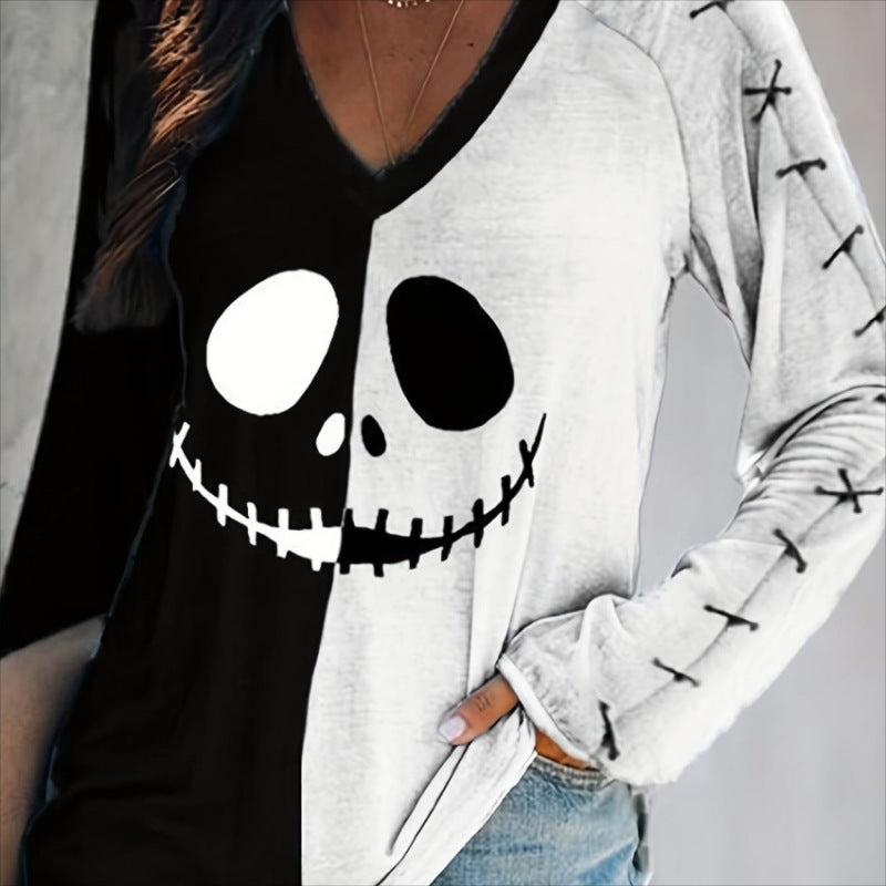 En résumé : Ce t-shirt décontracté pour femme présente un imprimé tête de mort saisissant aux couleurs contrastées et un col en V. Fabriqué dans un mélange confortable de polyester et d'élasthanne, il offre une coupe ample idéale pour une tenue décontractée pendant Halloween ou une sortie décontractée.