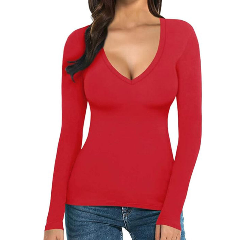 Women Casual Long-Sleeve V-Neck Polyester T-Shirt