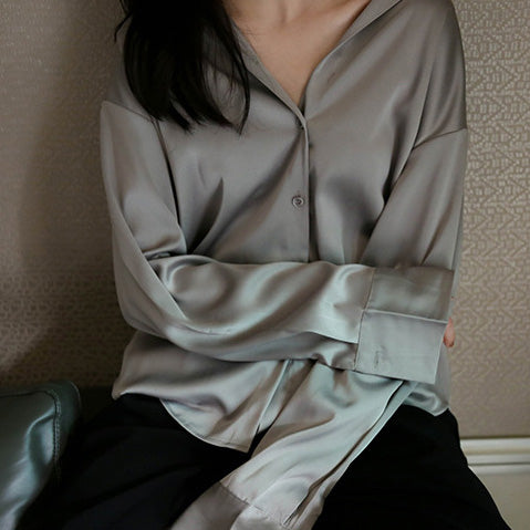 This women’s casual blouse features a luxurious satin fabric with a solid color design, long sleeves, and a lapel collar. Its loose fit and elegant wind style make it suitable for various occasions, combining comfort with sophisticated look.