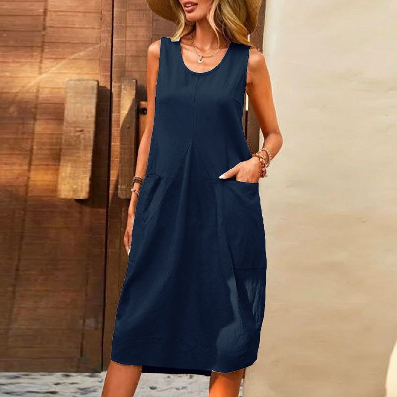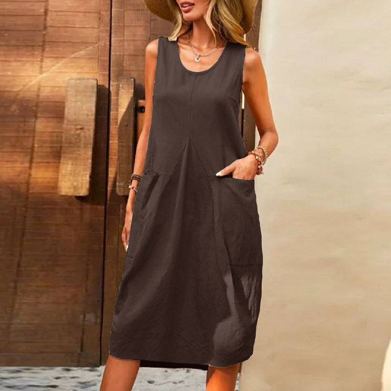 Robe décontractée sans manches en coton et lin de couleur unie pour femme