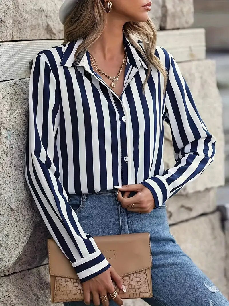 Ce chemisier décontracté à rayures et revers pour femme est idéal pour ajouter une touche chic à votre garde-robe. Fabriqué en polyester léger, il arbore un design urbain tendance qui apporte confort et polyvalence à vos tenues du quotidien.