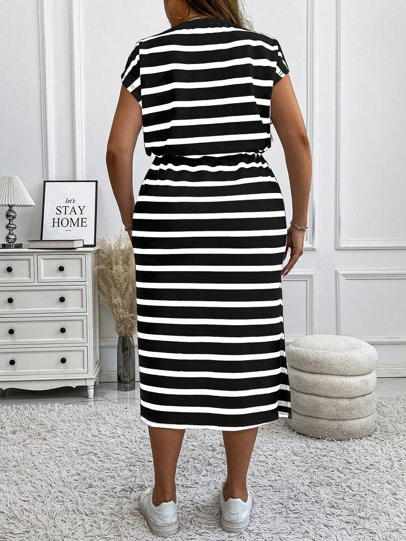 Découvrez le style décontracté de notre robe à lacets à manches courtes et col rond rayée pour femme, grande taille. Conçue pour le confort et l'élégance, cette robe flatte toutes les morphologies et offre une grande souplesse, ce qui en fait un incontournable de la garde-robe de toute femme à la mode en quête de confort et de style.