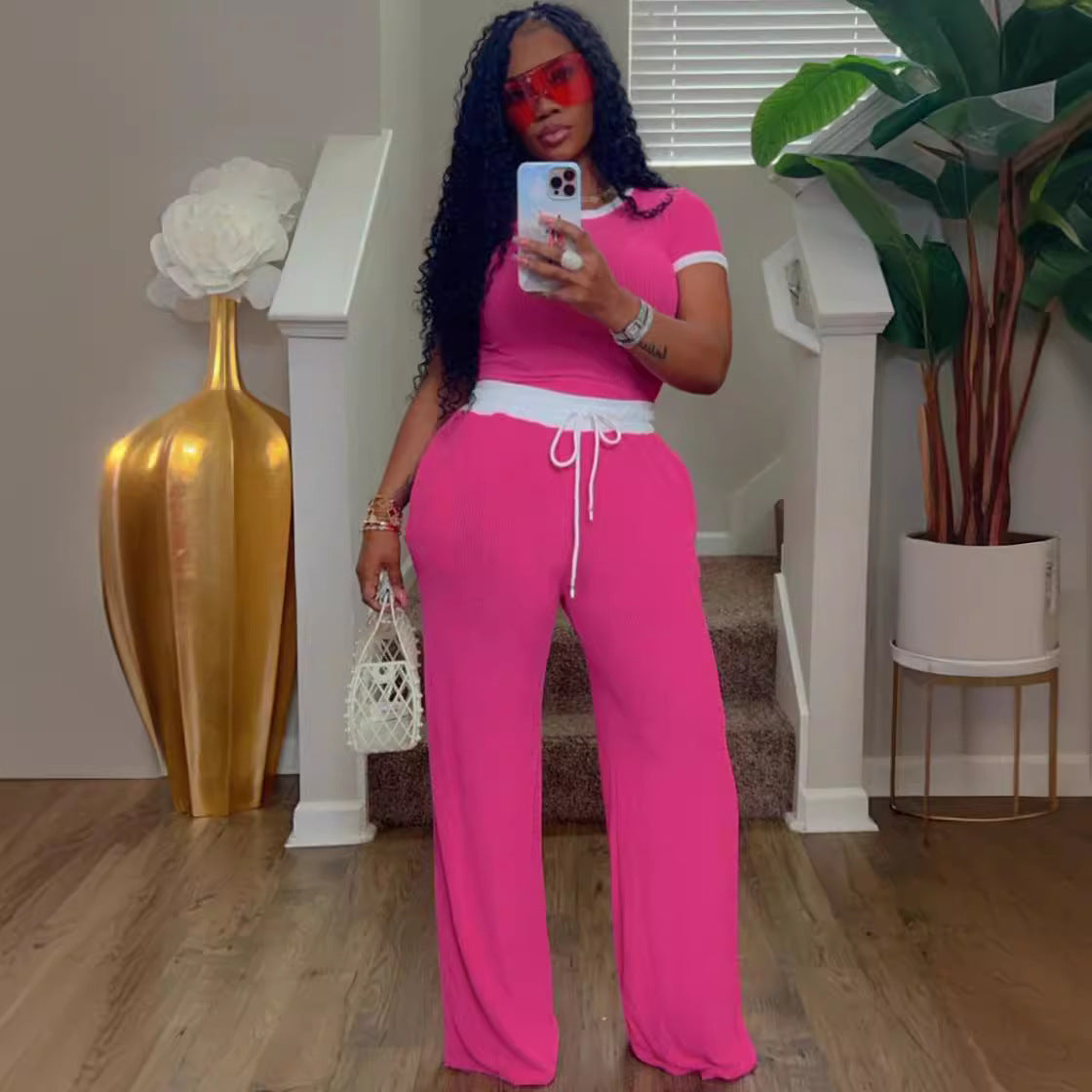 Ensemble t-shirt décontracté côtelé à contraste de couleurs pour femme
