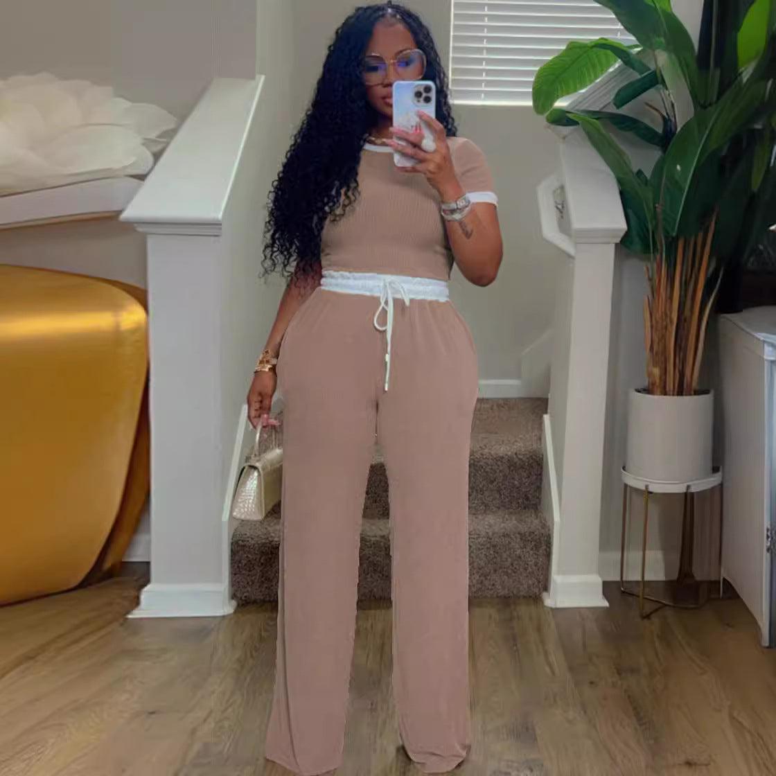 Cet ensemble deux pièces associe un t-shirt confortable à un pantalon élégant, le rendant polyvalent pour toutes les occasions. Avec sa coupe ajustée et son contraste de couleurs tendance, il sublime votre silhouette tout en vous assurant un confort optimal tout au long de la journée. Parfait à superposer ou à porter seul, c'est un incontournable pour toute femme avant-gardiste souhaitant sublimer son style décontracté.