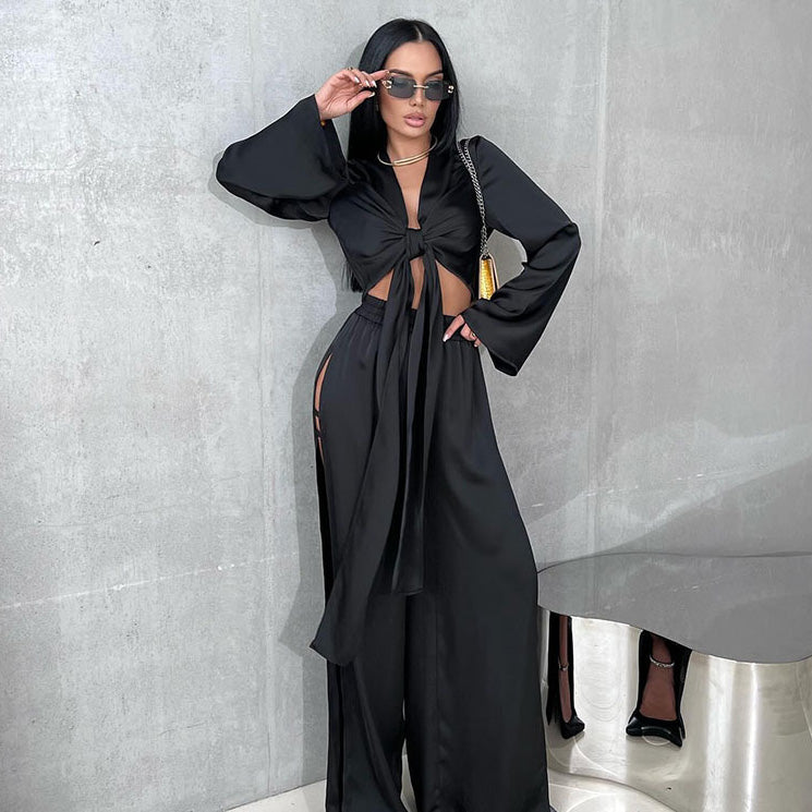 Ensemble deux pièces à lacets et manches longues pour femme, en polyester uni