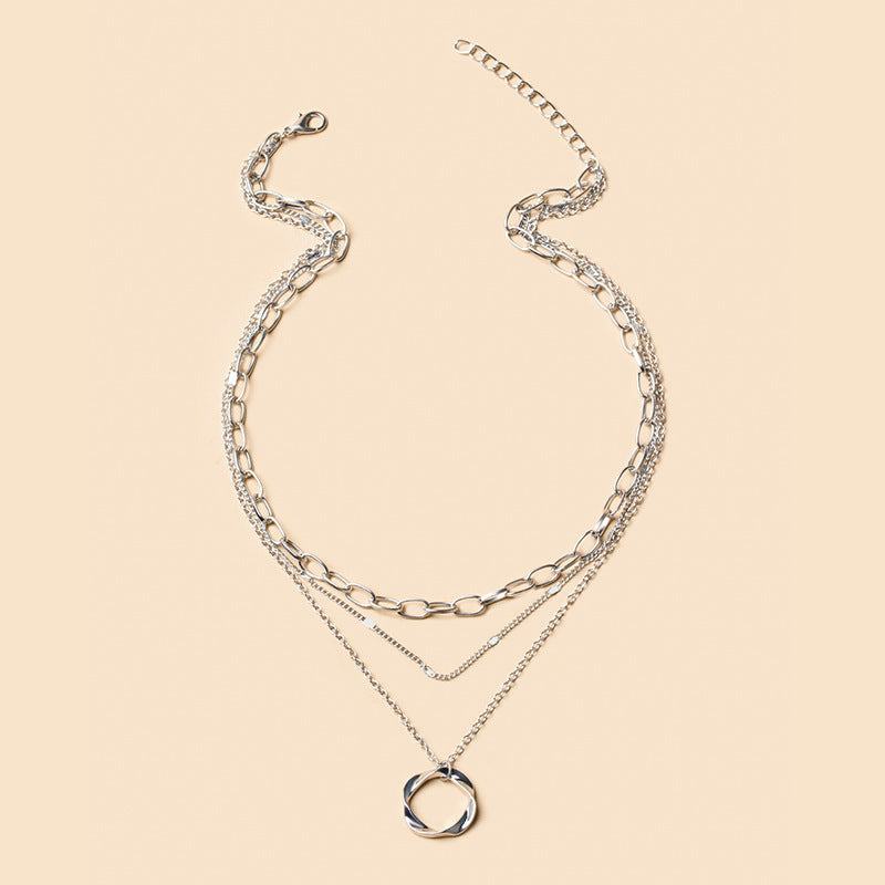 Ce collier multicouche élégant présente un design de chaîne géométrique avec un pendentif circulaire proéminent, parfait pour ajouter une touche moderne à n'importe quelle tenue.