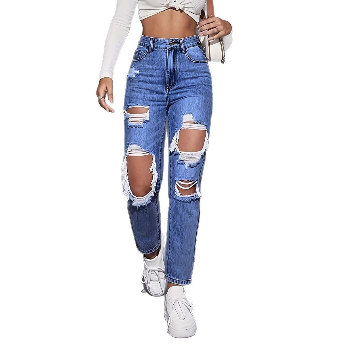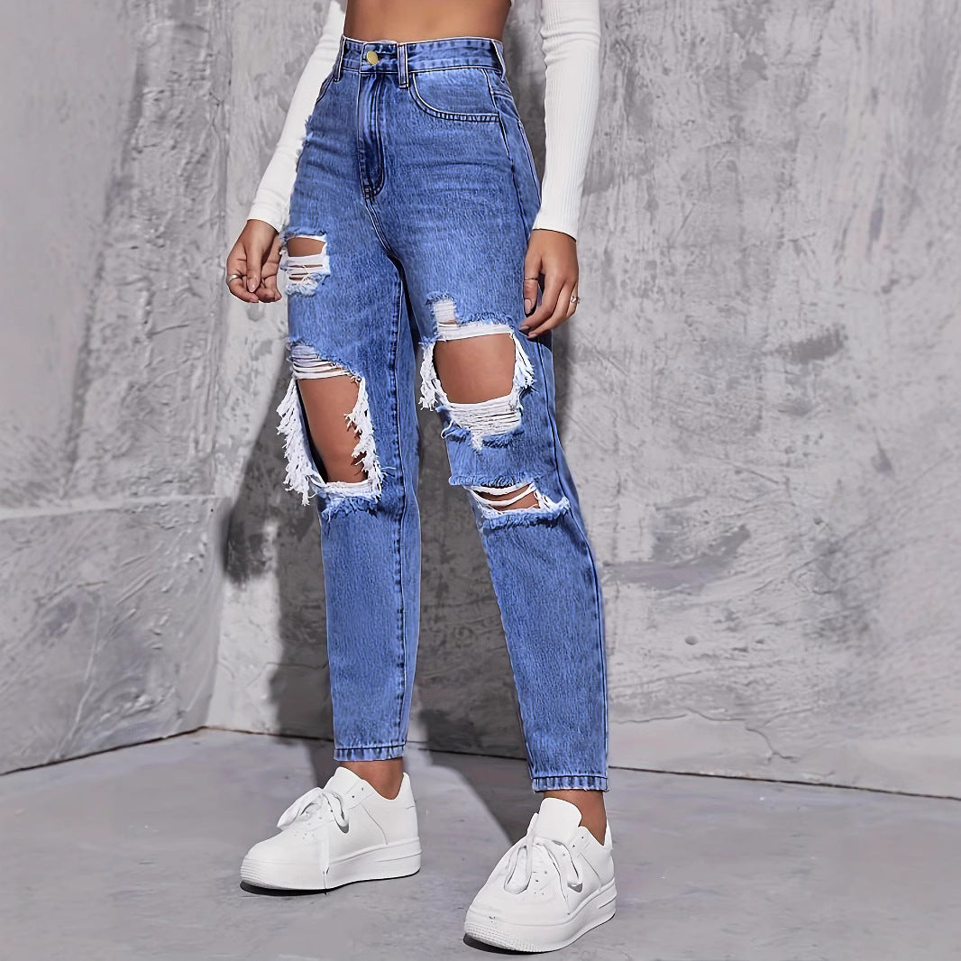 - Style : Design déchiré tendance avec une coupe droite