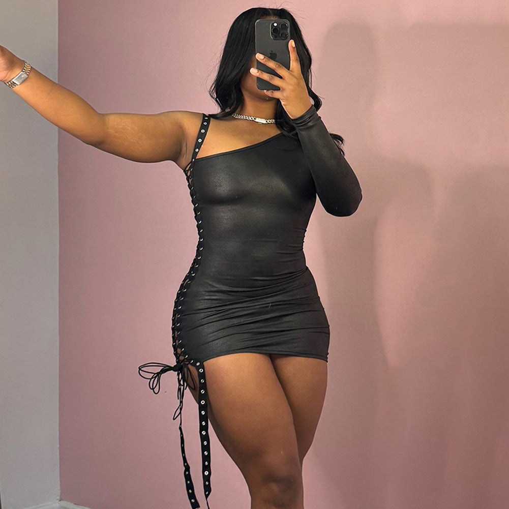 Robe sexy à lacets et col oblique pour femme, couleur unie