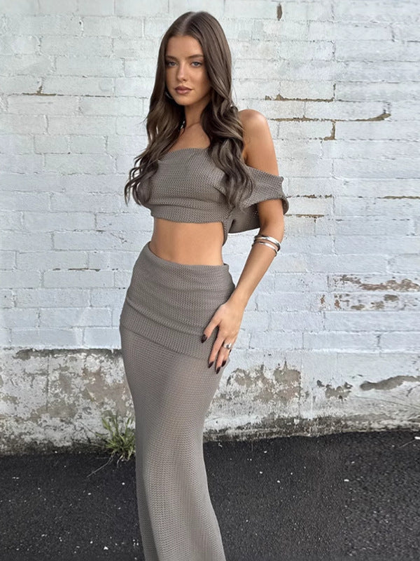 Ensemble haut court et jupe sexy à épaules inclinées de couleur unie pour femme