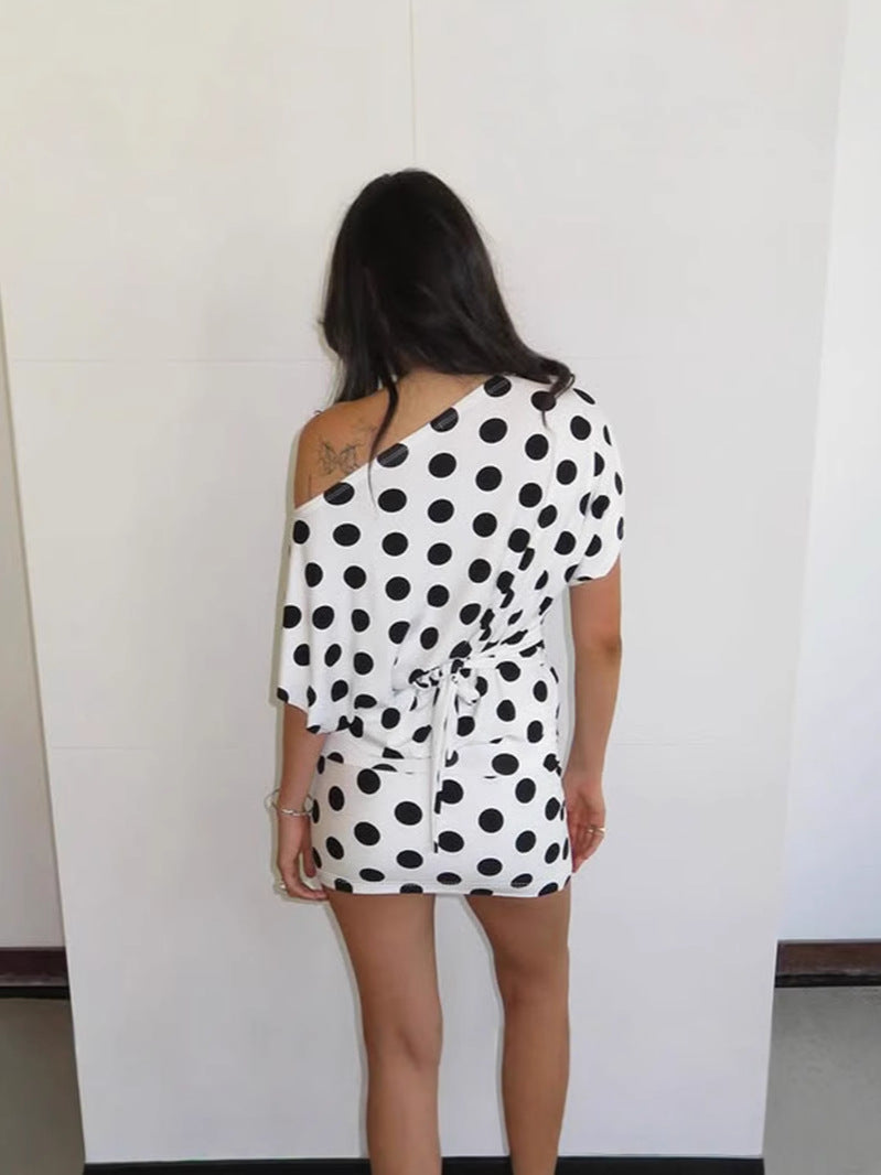 Cet ensemble deux pièces élégant comprend un t-shirt ajusté à manches courtes avec des imprimés de pois ondulés ludiques et une jupe moulante assortie, parfait pour les femmes modernes à la recherche d'un look à la mode et confortable.