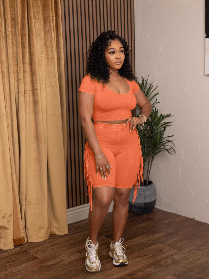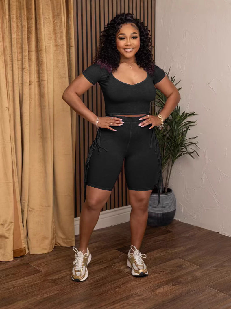 Ensemble t-shirt à manches courtes et short à pompons latéraux pour femme, couleur unie, tendance