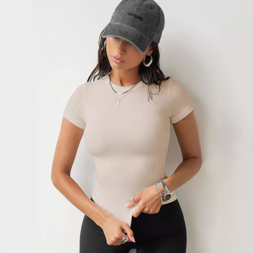 Rehaussez votre garde-robe avec notre t-shirt simple et tendance à manches courtes et col rond pour femme. Polyvalent, ce t-shirt allie confort et style, un incontournable pour toute femme à la pointe de la mode. Idéal pour les sorties décontractées ou à superposer avec vos pièces préférées.