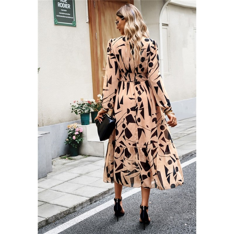 Casual Irregular Color Block Printed V-Neck Long-Sleeved Dress