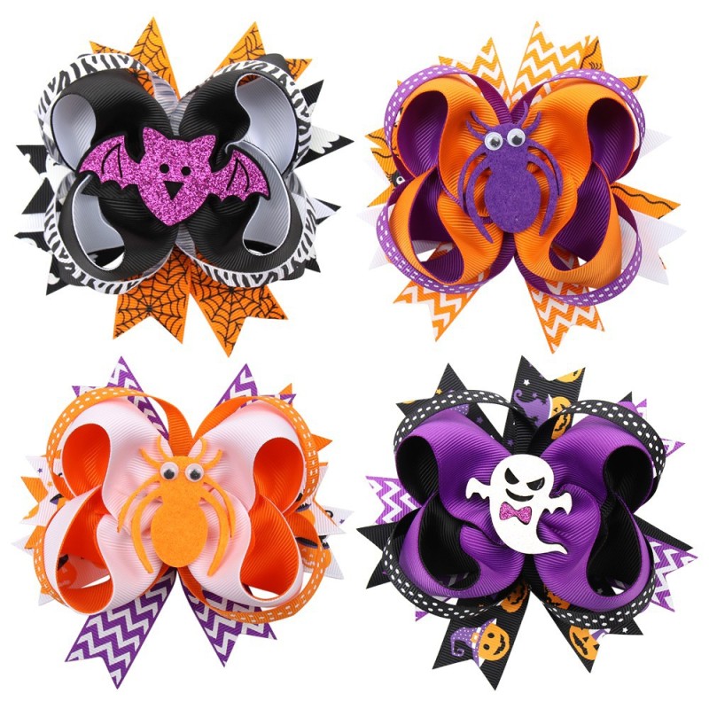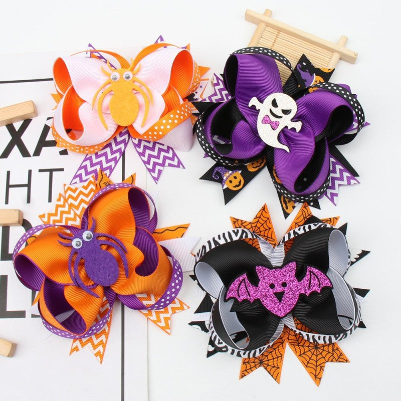 Design: Each hairclip has a cute cartoon motif, including orange spiders, purple bats, purple spiders, and white ghosts, all styled with bow tie patterns for a playful and festive look.