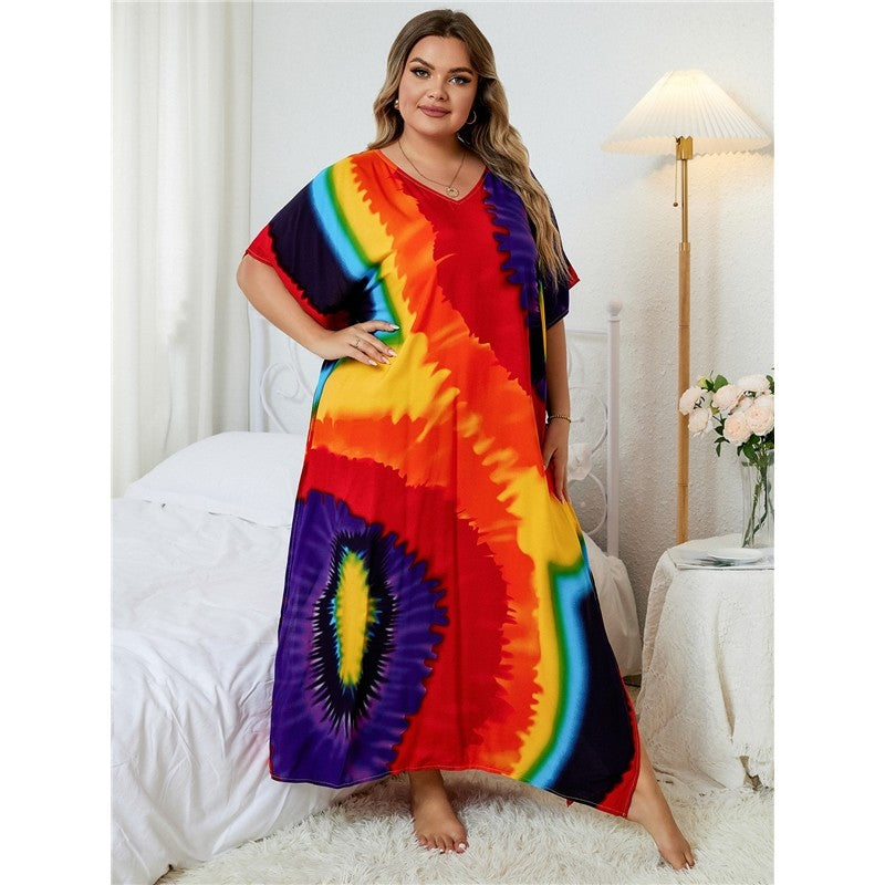 Contrast Color Printing V-Neck Short Sleeve Casual Loose Long Beach Dress Bikini Cover-Up