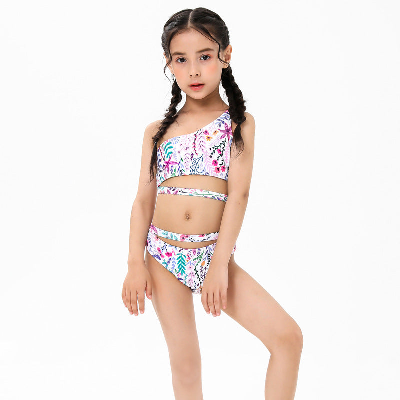 Elevate your little one's summer wardrobe with our trendy Girl Fashion Floral Printed Slanted Shoulder Top Shorts Swimwear Two-Piece Set. Crafted from high-quality polyester, this comfortable and stylish kids clothing set features a beautiful floral print that is perfect for beach days and pool parties.