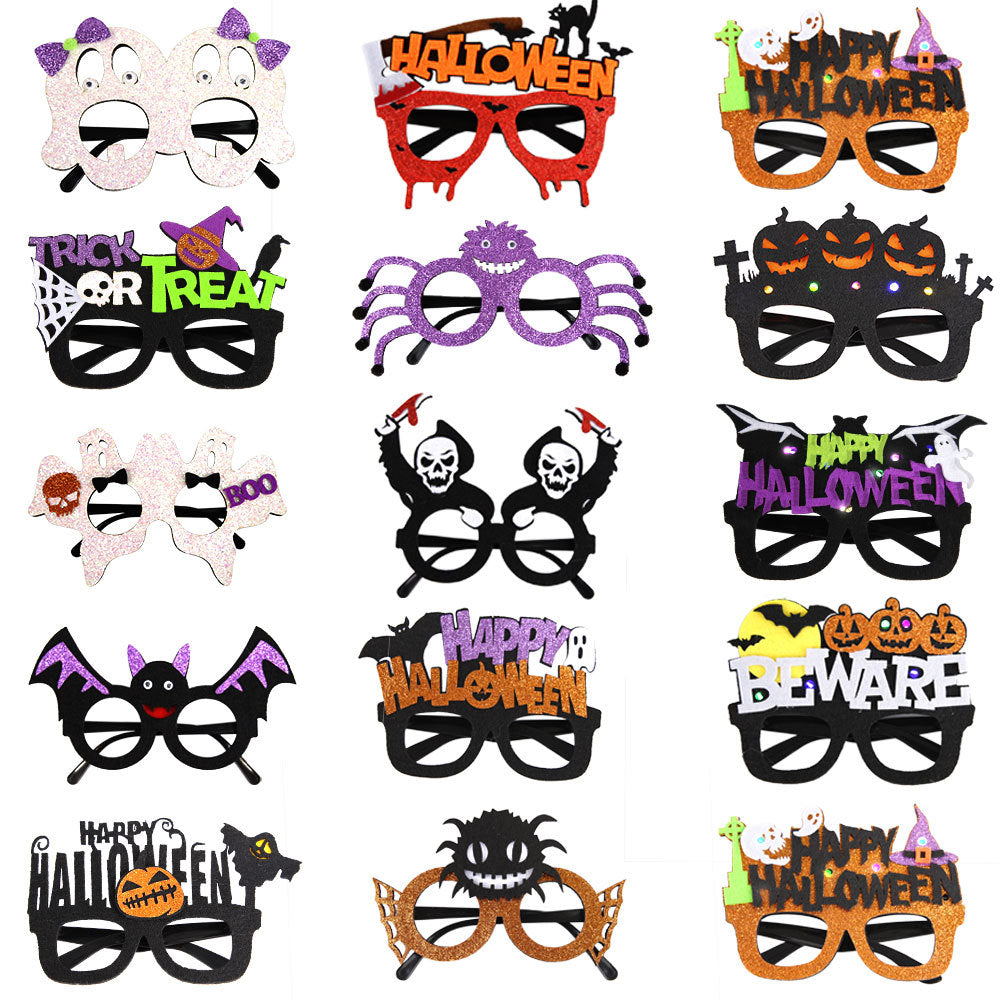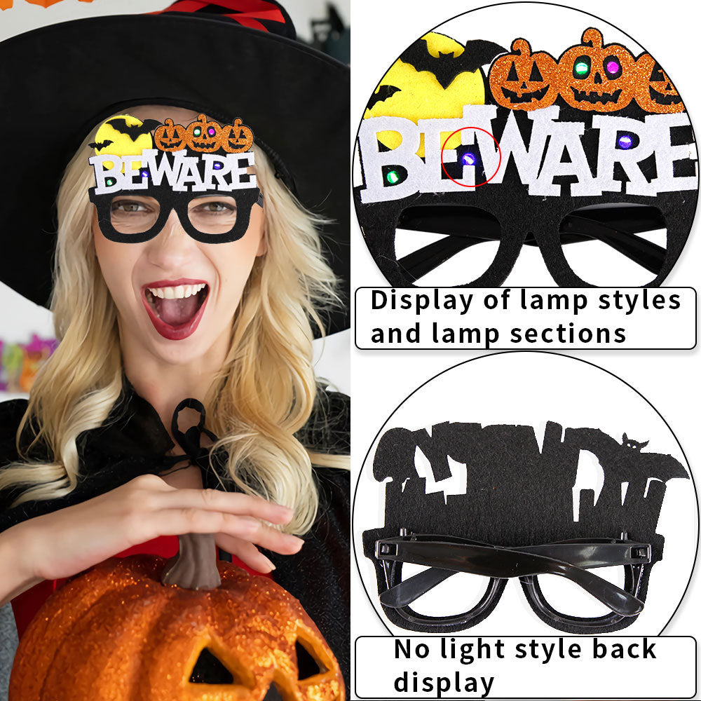 Enhance your Halloween costume with these themed glasses made of durable plastic and glitter details, featuring glowing and spooky designs that add a festive touch to any costume or party event.