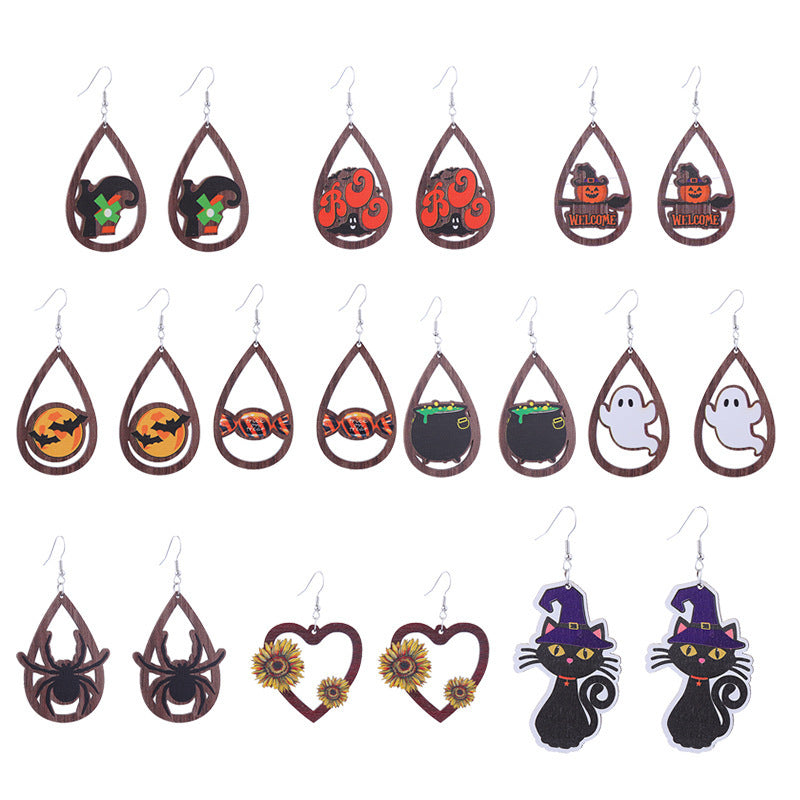 These playful earrings feature a combination of spooky and whimsical designs crafted from wood, perfect for adding a touch of personality to Halloween costumes or everyday outfits. Their unique animal and zodiac style makes them a standout accessory.