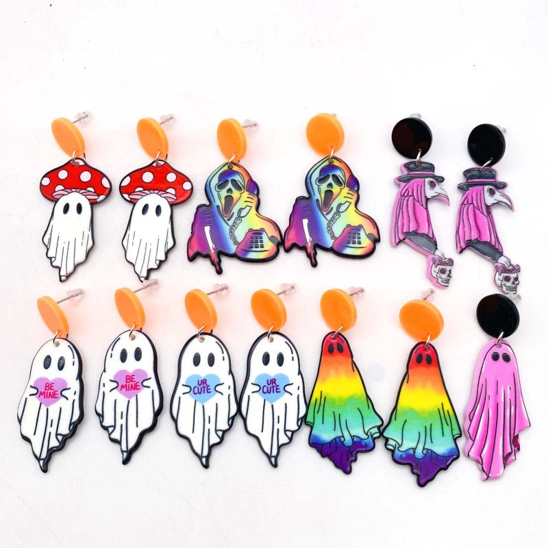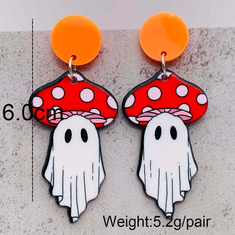 These playful earrings feature cartoon-style mushroom head ghosts crafted from lightweight acrylic, offering a fun and spooky accessory perfect for Halloween or costume parties. The unisex, fashionable design complements various outfits and adds a quirky touch.