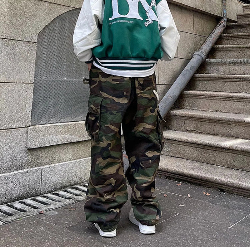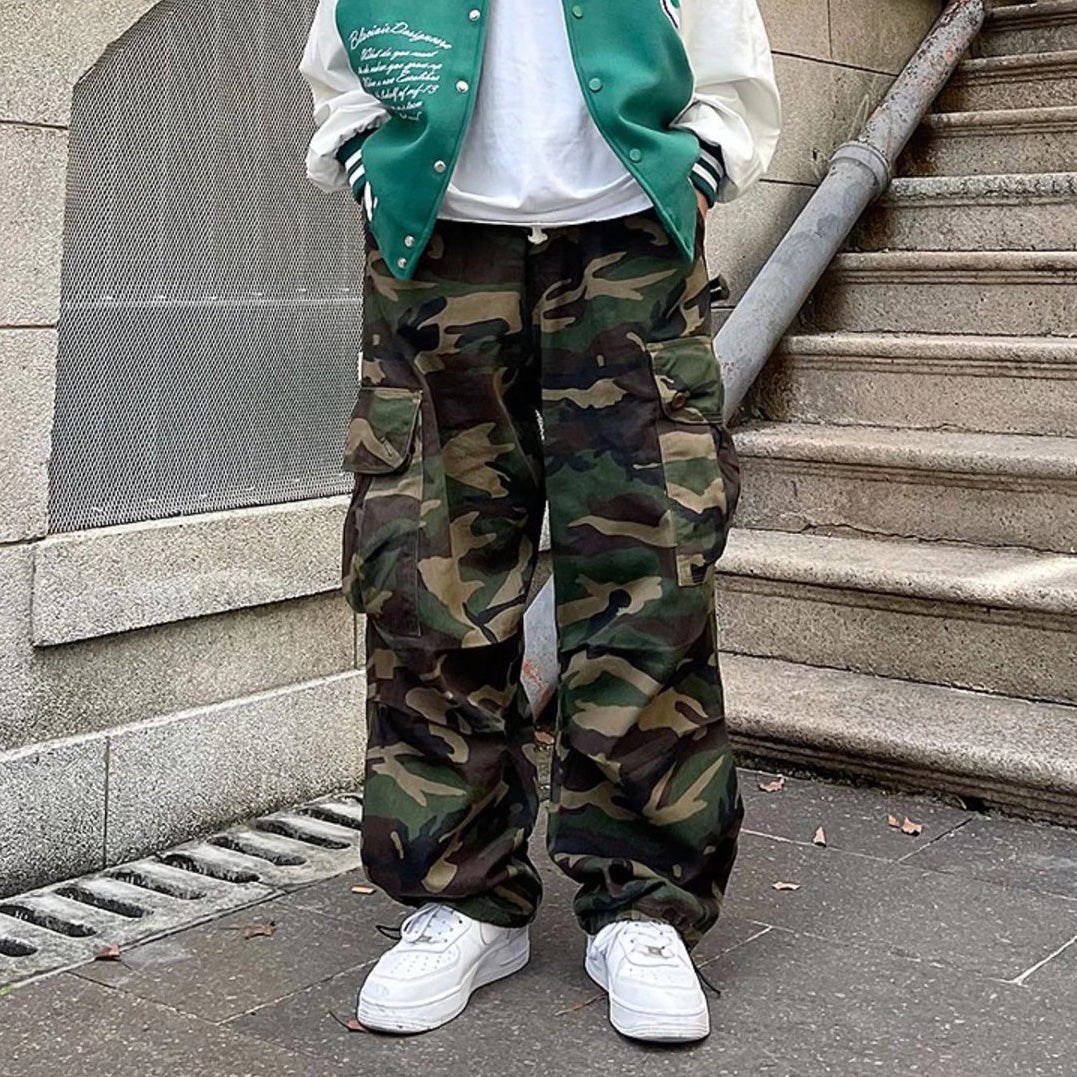 Design Features: The pants feature a classic camouflage pattern, adding a rugged aesthetic. The straight pants opening allows easy wear and movement. Multiple pockets are incorporated for functionality, including side and rear pockets for storage and convenience.