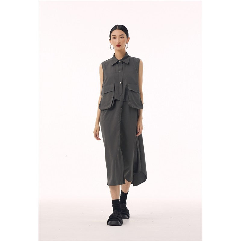 Polo Collar Vest Dress With Large Pocket