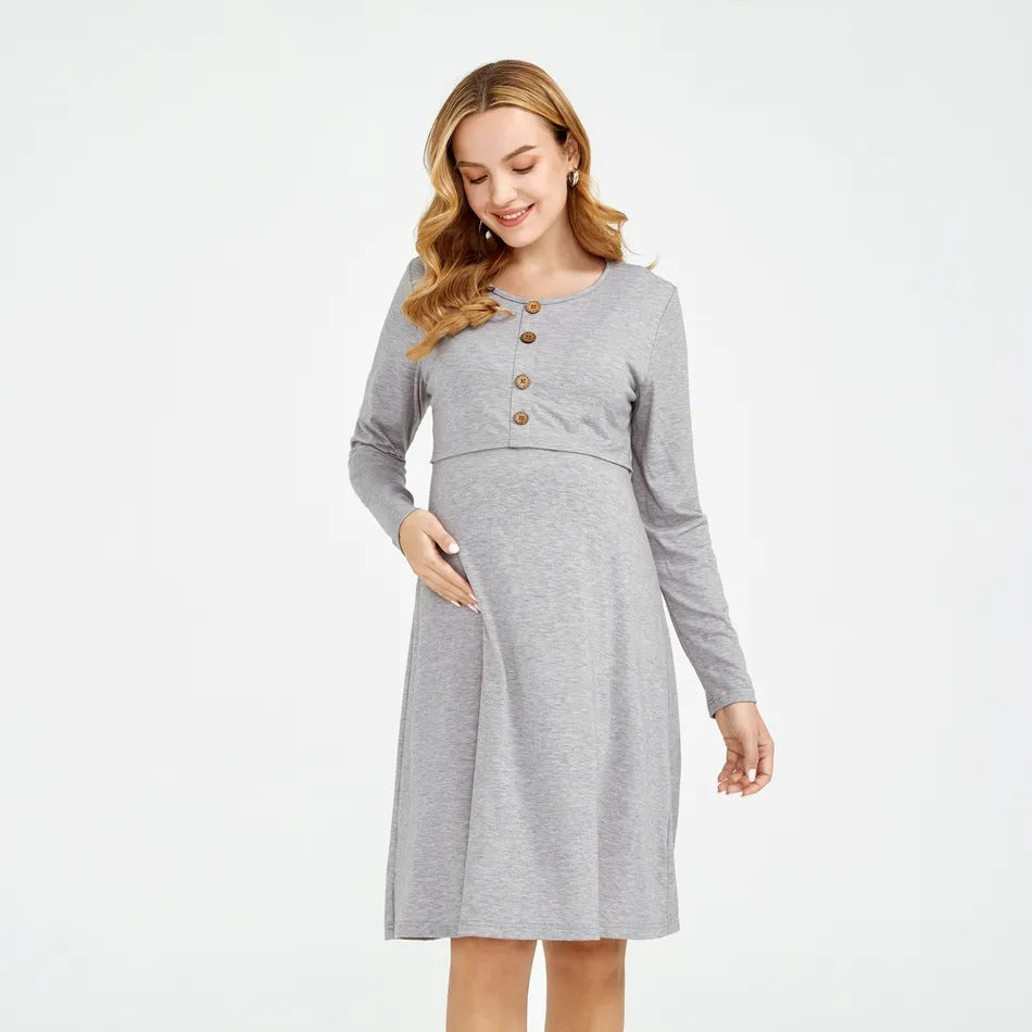 Pregnant Women Casual Solid Color Round Neck Dress