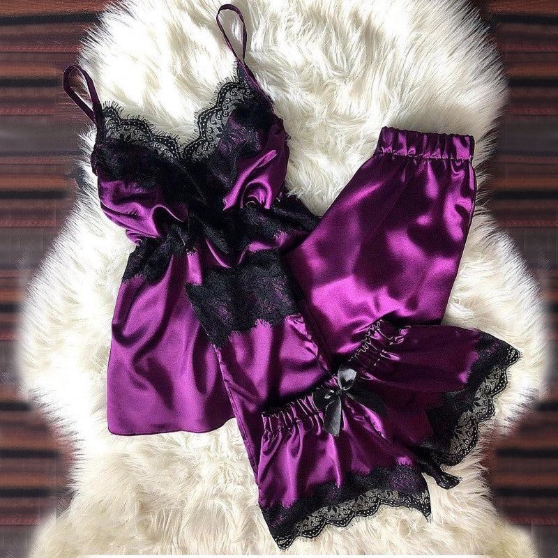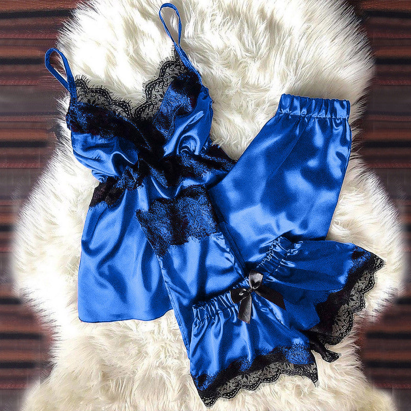 Sexy Women Solid Color Satin Lace Patchwork Pajamas Set