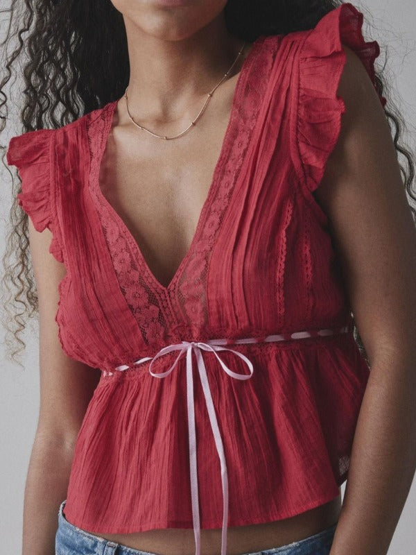 Simple V-Neck Lace Tie Waist Top
