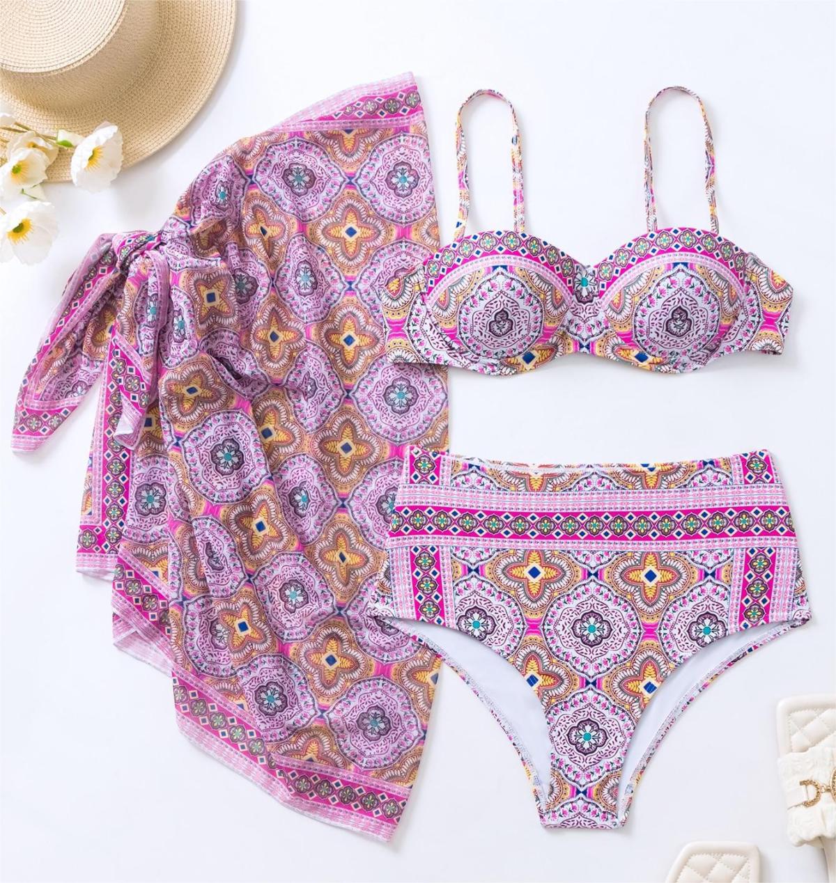 Elevate your beach style with our Summer Vacation Women Ethnic Boho Three-Piece Sexy Bikini Coverup Swimwear, crafted from high-quality polyester for durability and comfort. Perfect for those sunny days by the pool or on the beach, this vibrant set makes a fashionable statement.
