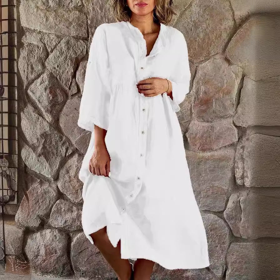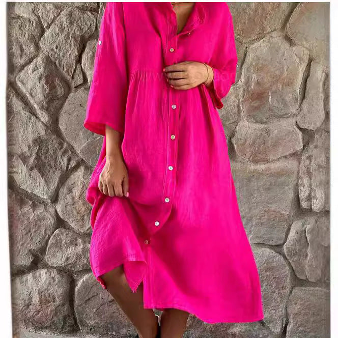 Elevate your wardrobe with our Summer Women Casual Solid Color Button Long Sleeve Cotton Linen Dress. This elegant piece features a comfortable fit and versatile design, perfect for various occasions. Crafted from high-quality polyester, it offers a soft and breathable feel for all-day wear.