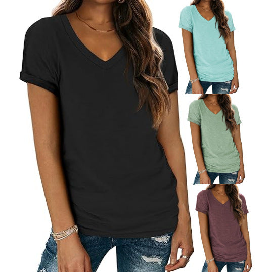 Summer Women Casual Solid Color V-Neck Short Sleeve Blank T-Shirt