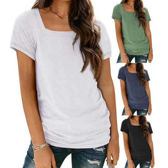 Summer Women Casual Square Collar Solid Color Blank T-Shirt