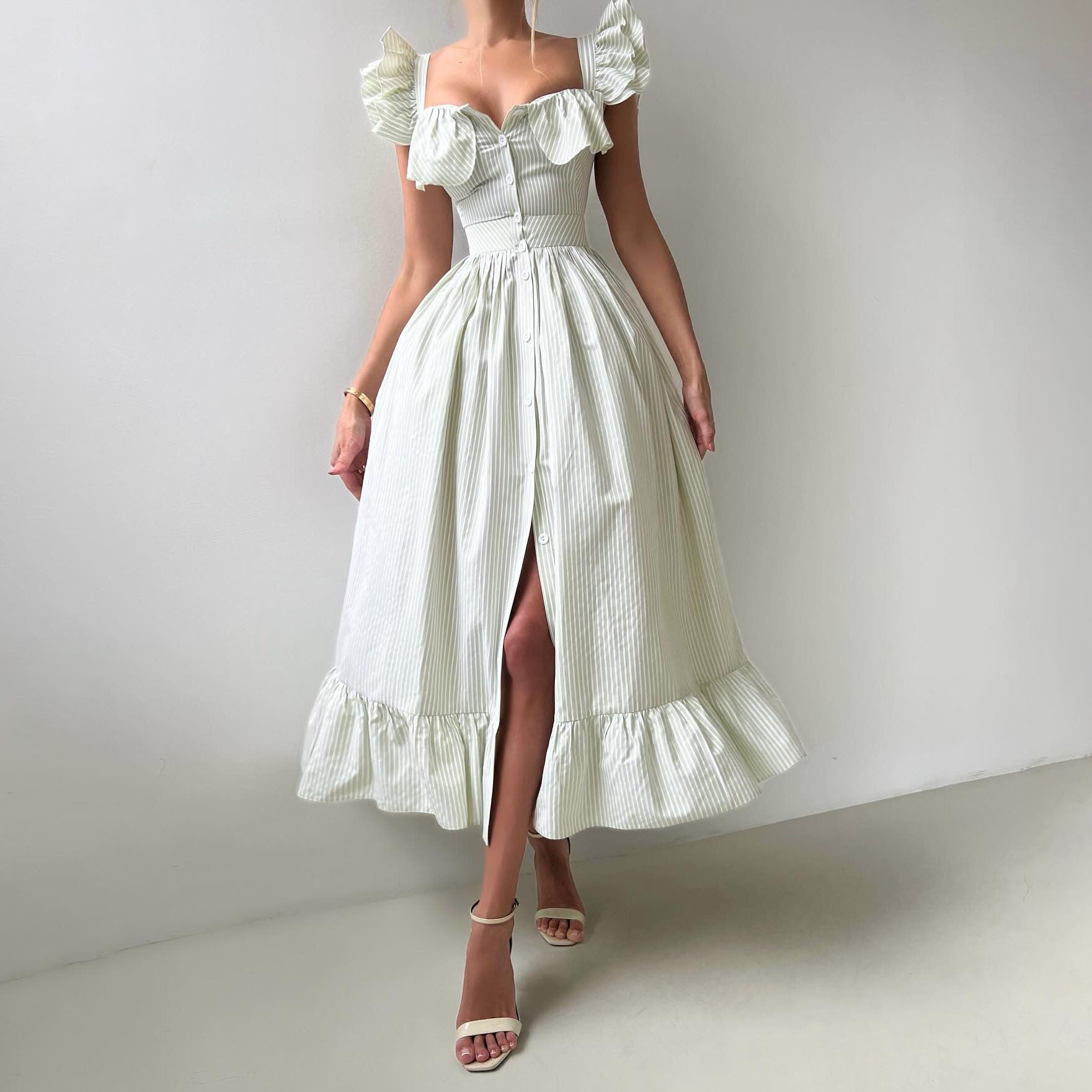 Trendy Square Neck Striped Ruffle Midi Dress