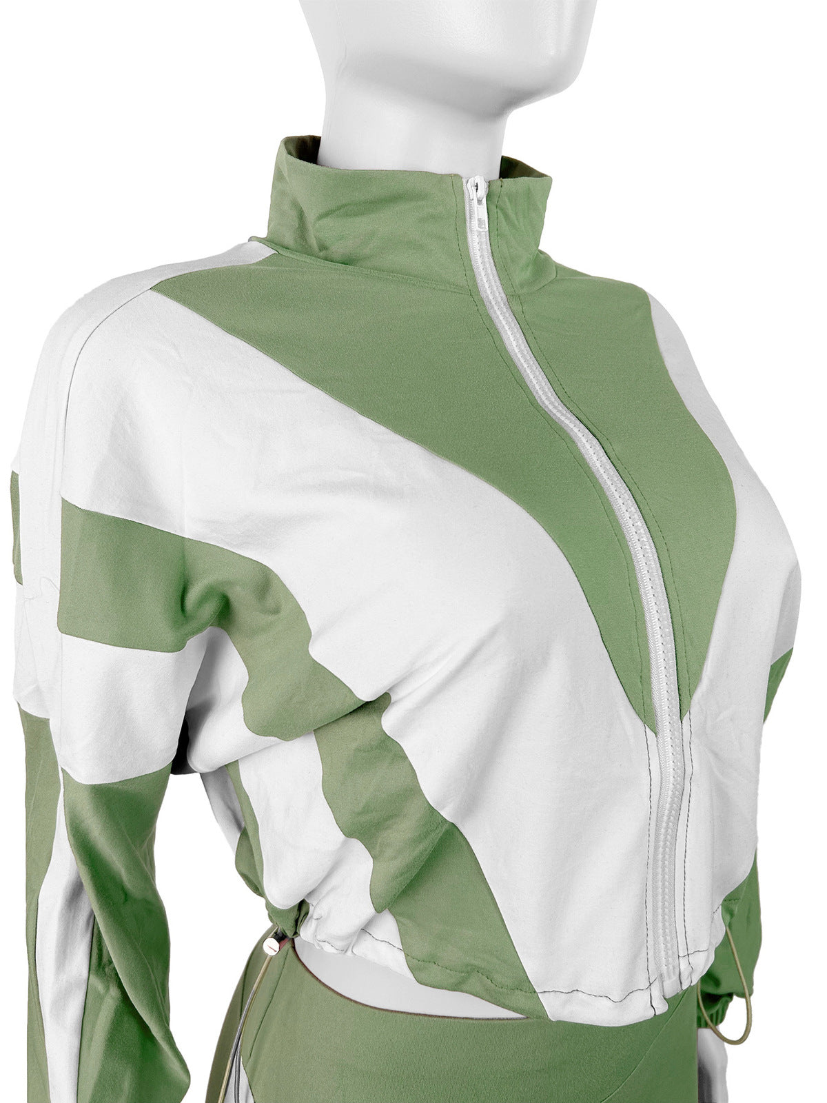 Design: Featuring a zip-up crop sweatshirt with bubble long sleeves and a pair of fitted waist-tight pants, both showcasing eye-catching color block stitching and a trendy, modern silhouette.