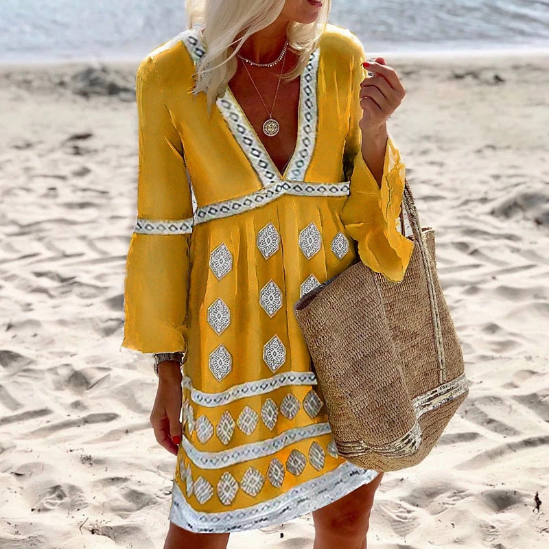 Women Bohemian Elegant Long Sleeves V Neck Loose Dress