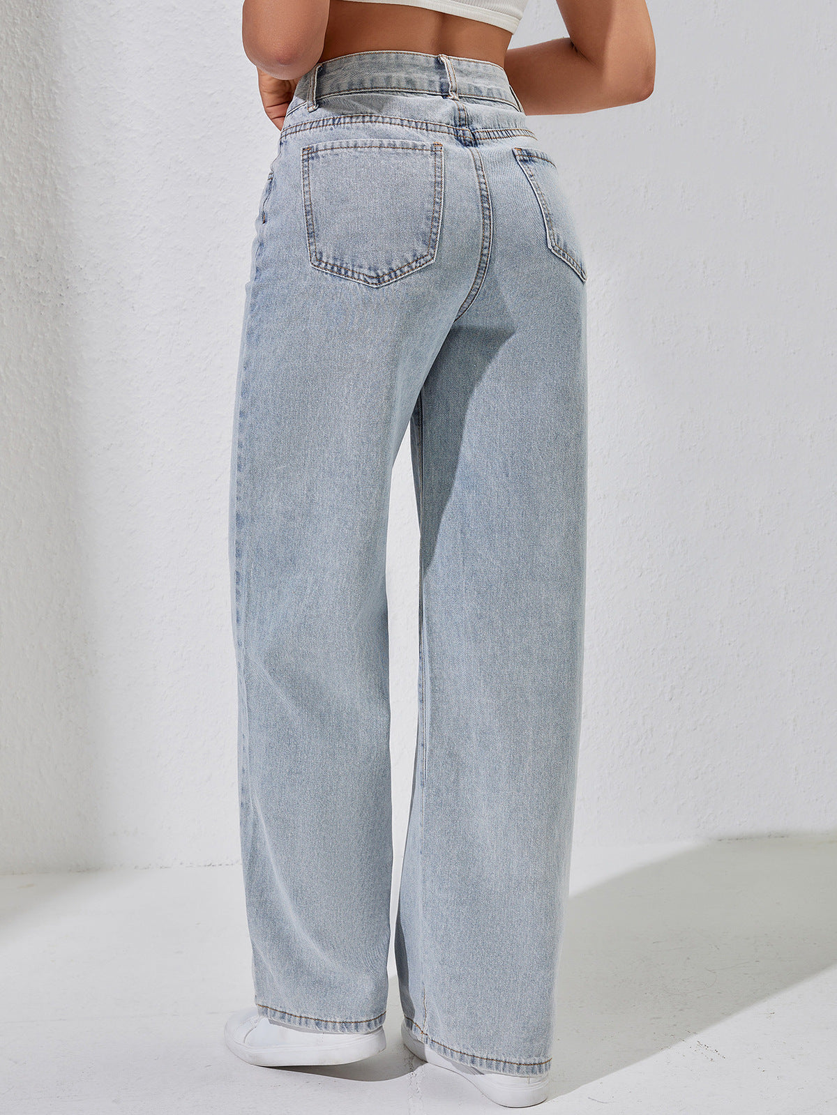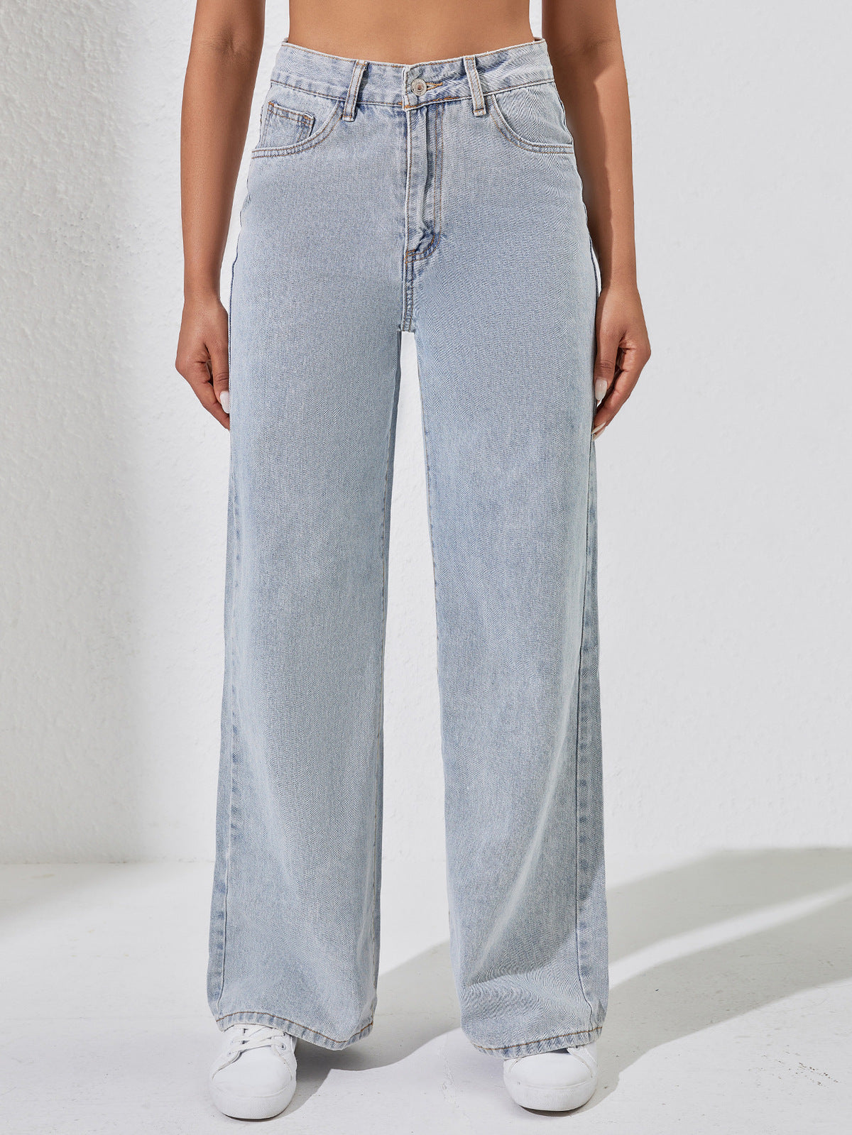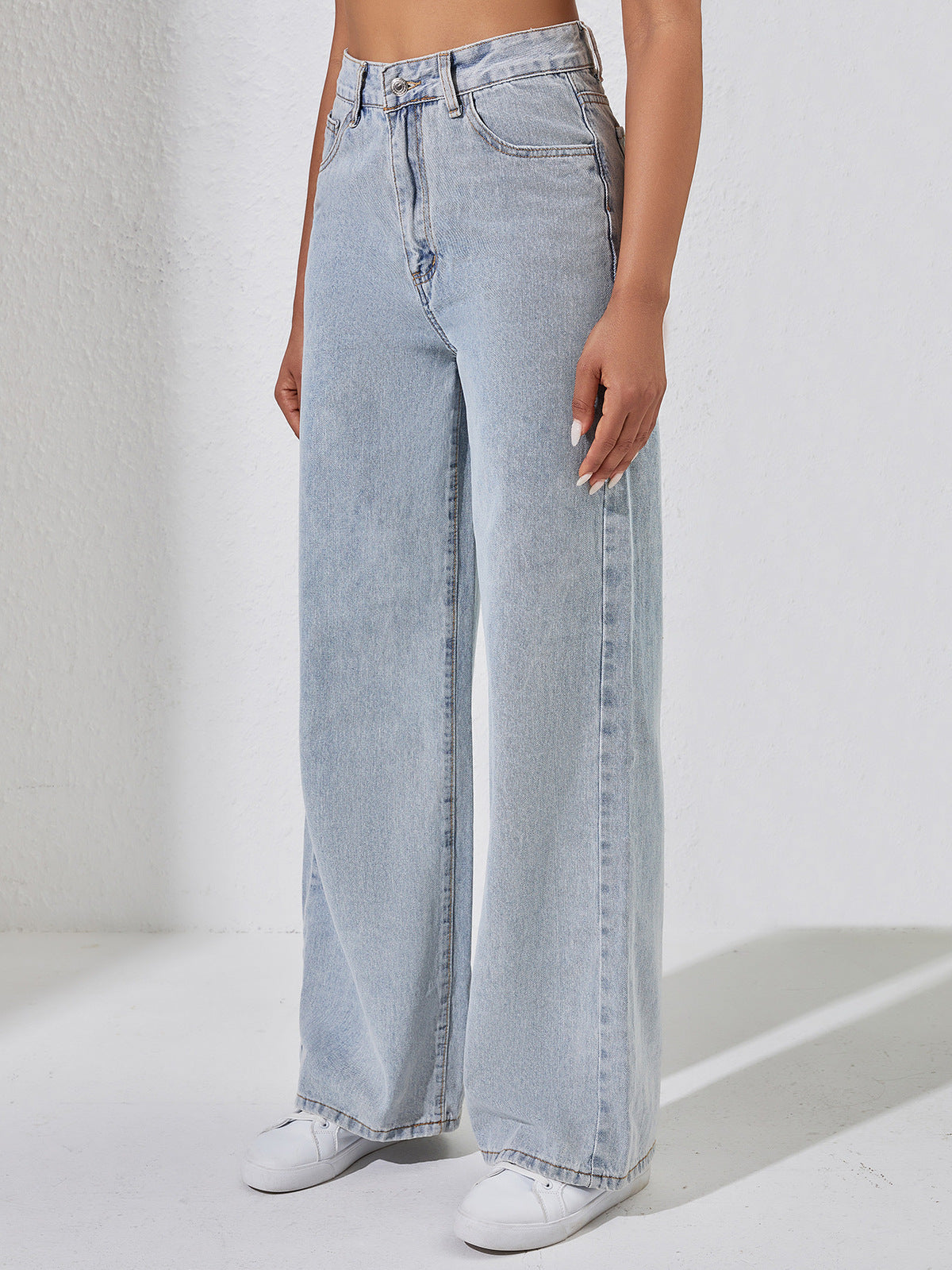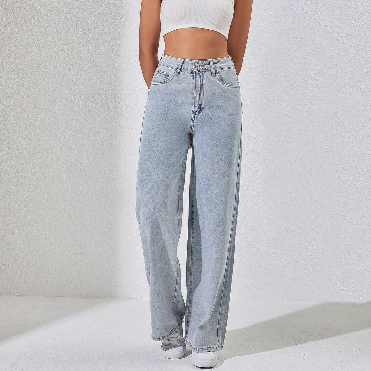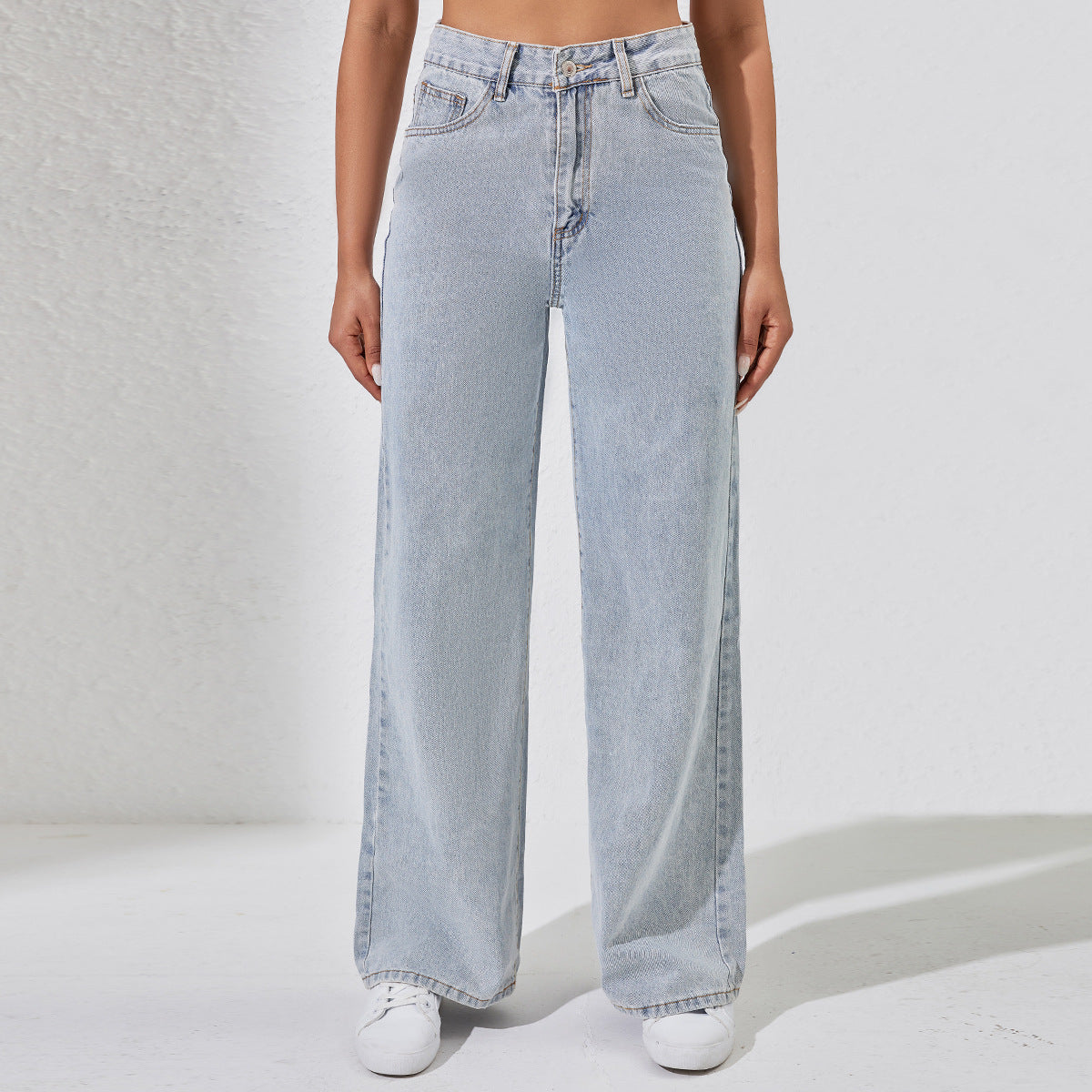 These women’s fashion jeans feature a high waist and wide leg design crafted from durable denim material. They are perfect for casual streetwear looks, combining comfort and style with a classic straight-leg silhouette and versatile blue color.