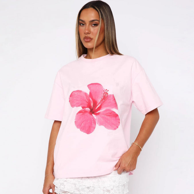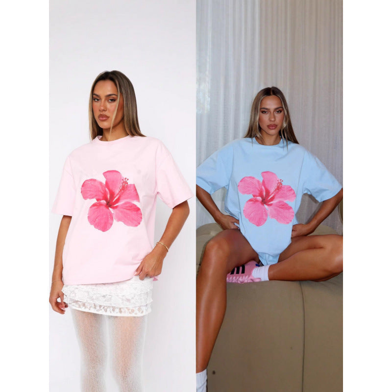 This women’s casual T-shirt features a floral print design crafted from soft cotton fabric. Its loose fit and crewneck style provide comfort and a fresh, adorable look suitable for everyday wear in multiple colors and sizes.
