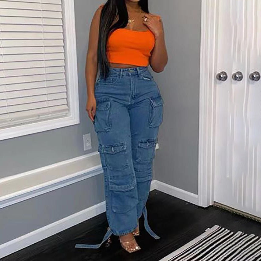 Design and Fit: The jeans feature a high waistline with a loose, relaxed fit that provides ease of movement. The multi-pocket design adds functional storage options and visual interest. The style aligns with street hipster fashion, emphasizing practicality with a trendy edge.