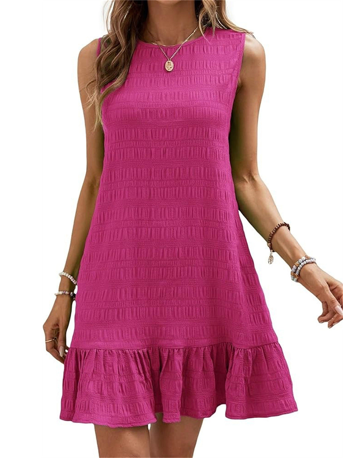 This women’s casual dress features a solid color design crafted from polyester, providing comfort and style. Its short length and A-line skirt shape make it suitable for everyday wear and casual outings. The crewneck and sleeveless style offer a relaxed and modern look.