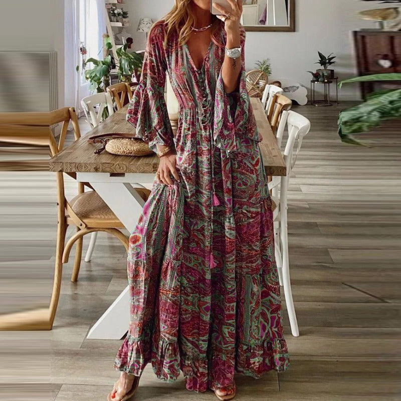Women Fashion Casual Bohemian Tiny Flower Print V-Neck Horn Sleeve Maxi Dress