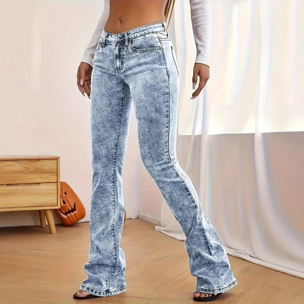 Designed with a classic long length and hipster micro-style, these jeans have a streamlined silhouette that enhances a slim fit appearance. The mid-waistline provides a flattering fit, while the basic denim type supports easy pairing with various tops and footwear.