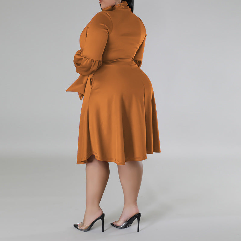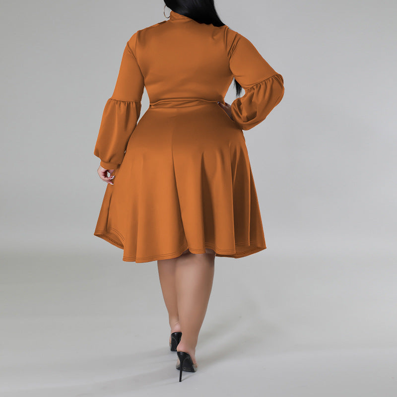 This long casual dress features a solid color design with distinctive bubble sleeves and a lace-up detail, crafted from soft milk fiber polyester blend. Available in vibrant colors and extended plus sizes, it offers stylish comfort for social occasions.