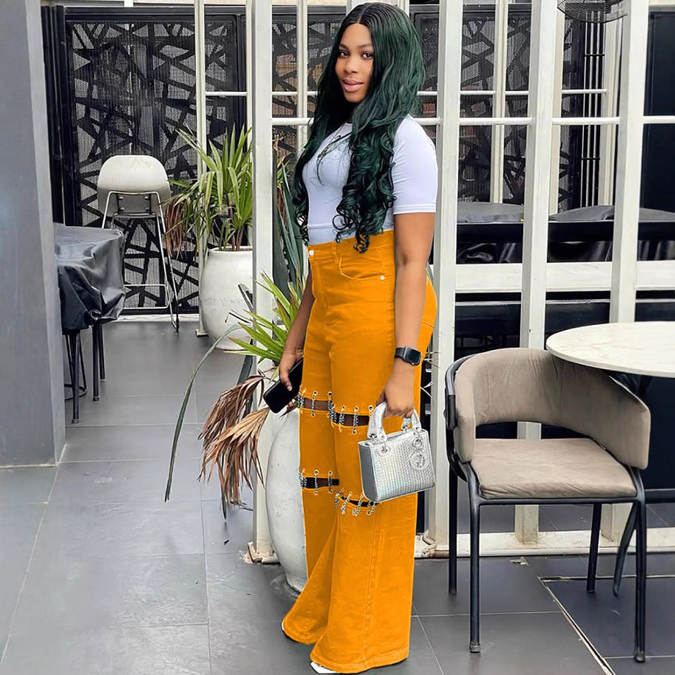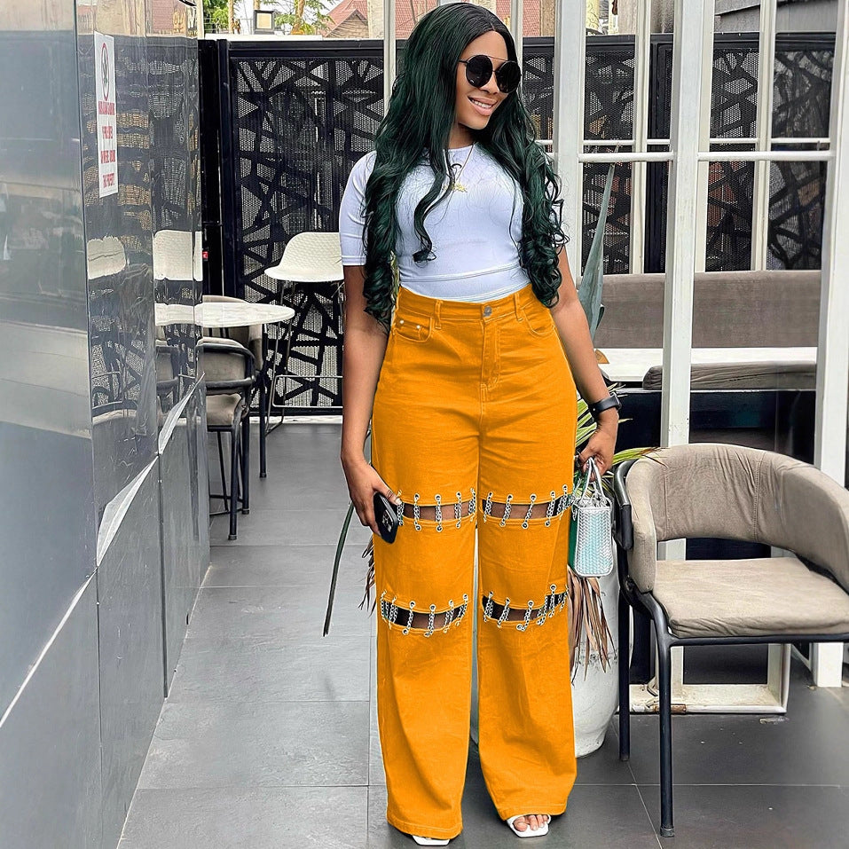 This pair of high waist jeans features a stylish chain accent and a classic straight leg cut, crafted from durable denim and polyester. Designed for a streetwear-inspired look, these jeans provide comfort and a trendy silhouette suitable for casual and urban outfits.