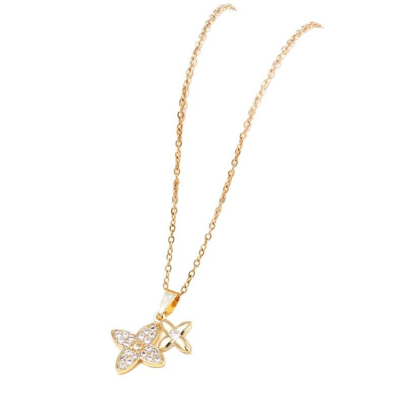 This elegant double four leaf flower necklace features rhinestones and is crafted from durable titanium steel, offering a luxurious and fashionable accessory suitable for daily wear and special occasions.