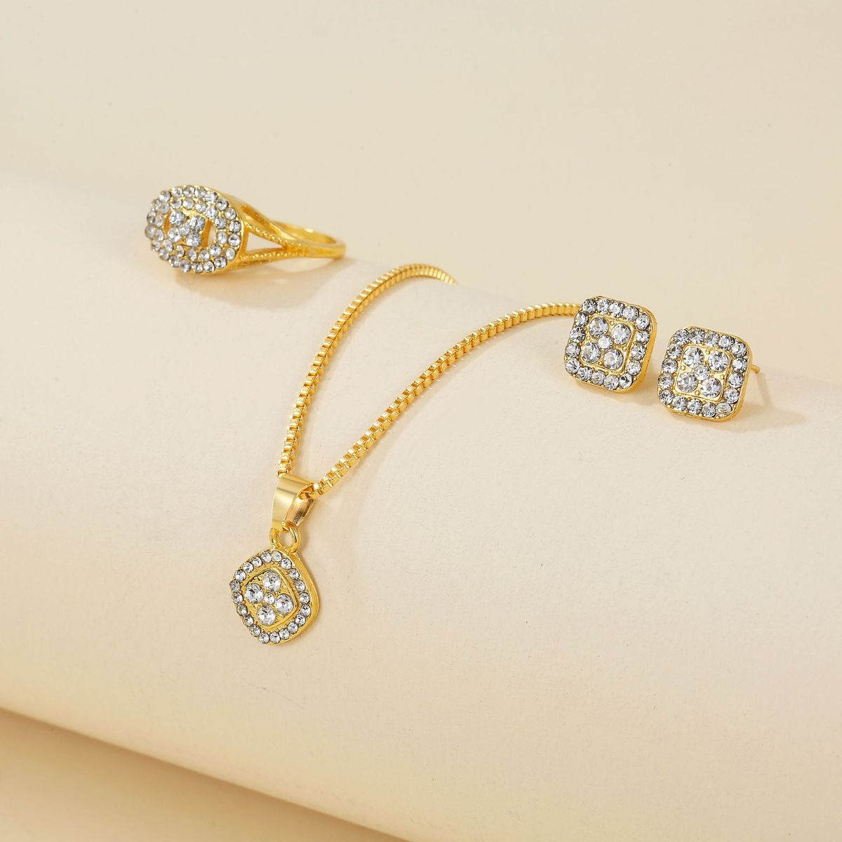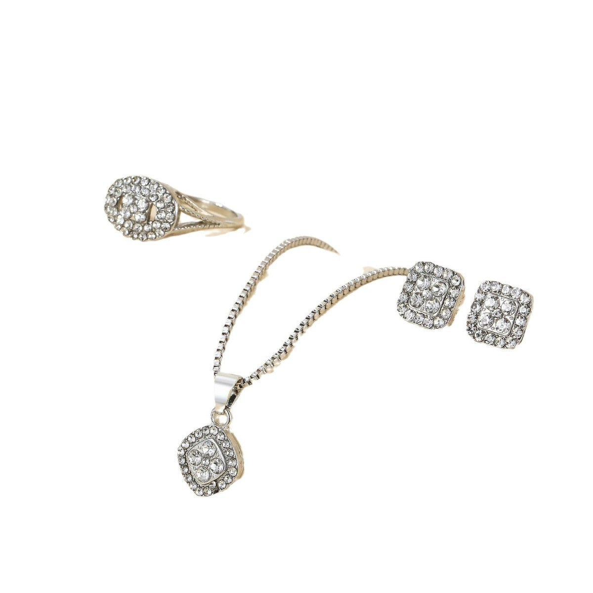 This stylish jewelry set includes a geometric necklace, ring, and earrings crafted from durable alloy. Featuring a modern square block design, it offers a fashionable and versatile accessory choice for daily wear or special occasions.