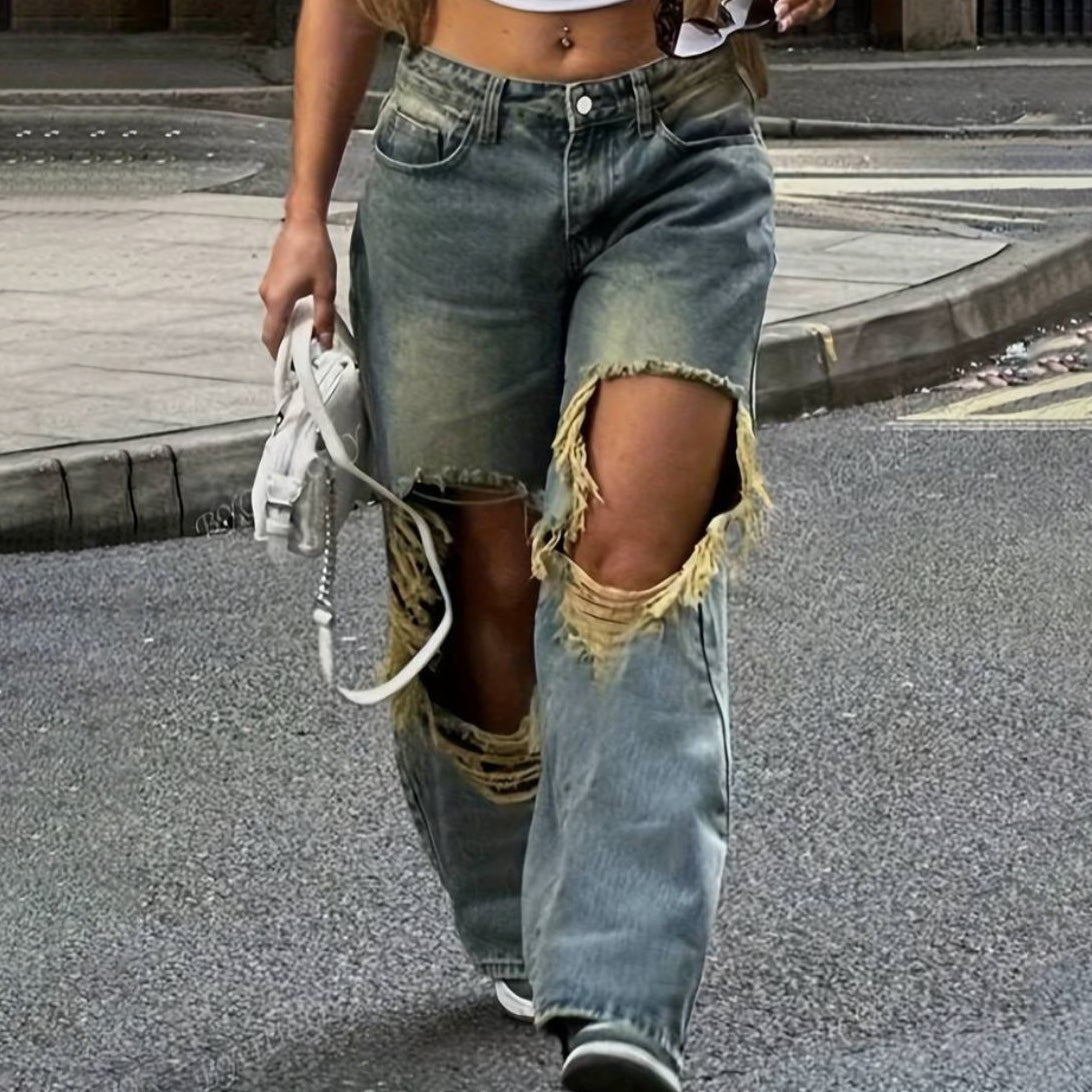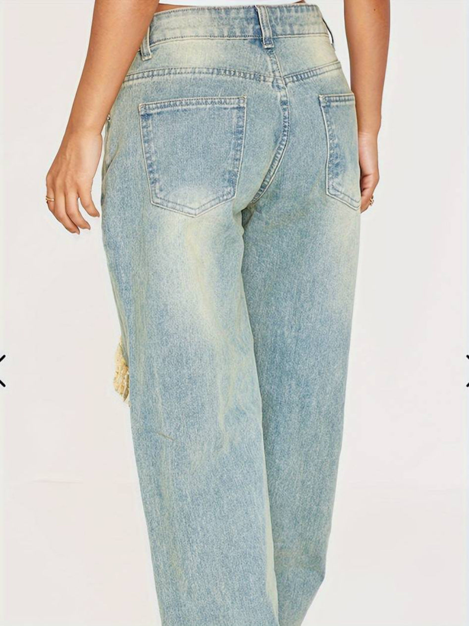 These women’s straight-leg jeans feature a low waist design with distressed ripped detailing, crafted from durable denim with cotton and polyester for comfort and longevity. Ideal for casual streetwear, they combine style and ease in a versatile fit.