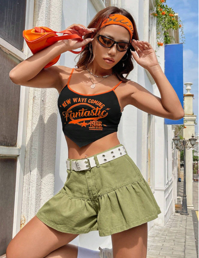 Design and Style: This crop top features an eye-catching irregular print pattern and non-removable shoulder straps that add to its street hipster aesthetic. The spaghetti strap design offers a flirty, youthful vibe perfect for casual and fashionable occasions.