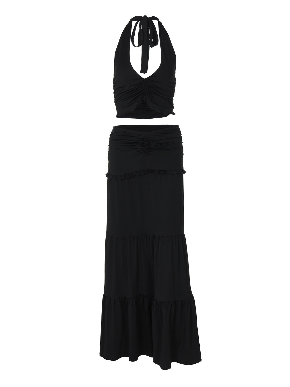 Sleeveless crop top paired with a long pleated skirt creates a trendy two-piece set